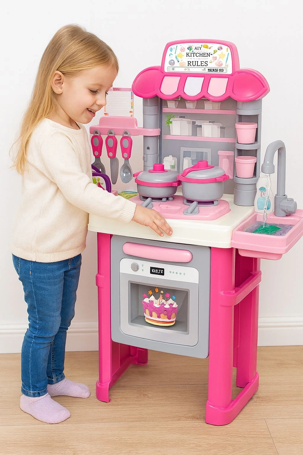 The Kitchen Set & Water Sink is a beautifully designed pretend-play kitchen for children aged 3 and above, featuring realistic details and a rich 40-piece accessory set.